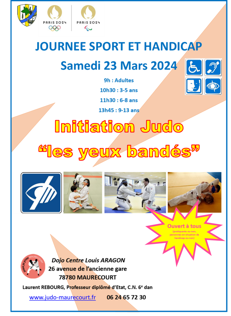 Dans le cadre de la Journée du Sport et du Handicap, notre club propose un cours d’initiation « Judo les yeux bandés (déficience visuelle) » OUVERT A TOUT LE MONDE (voyant, malvoyant, …